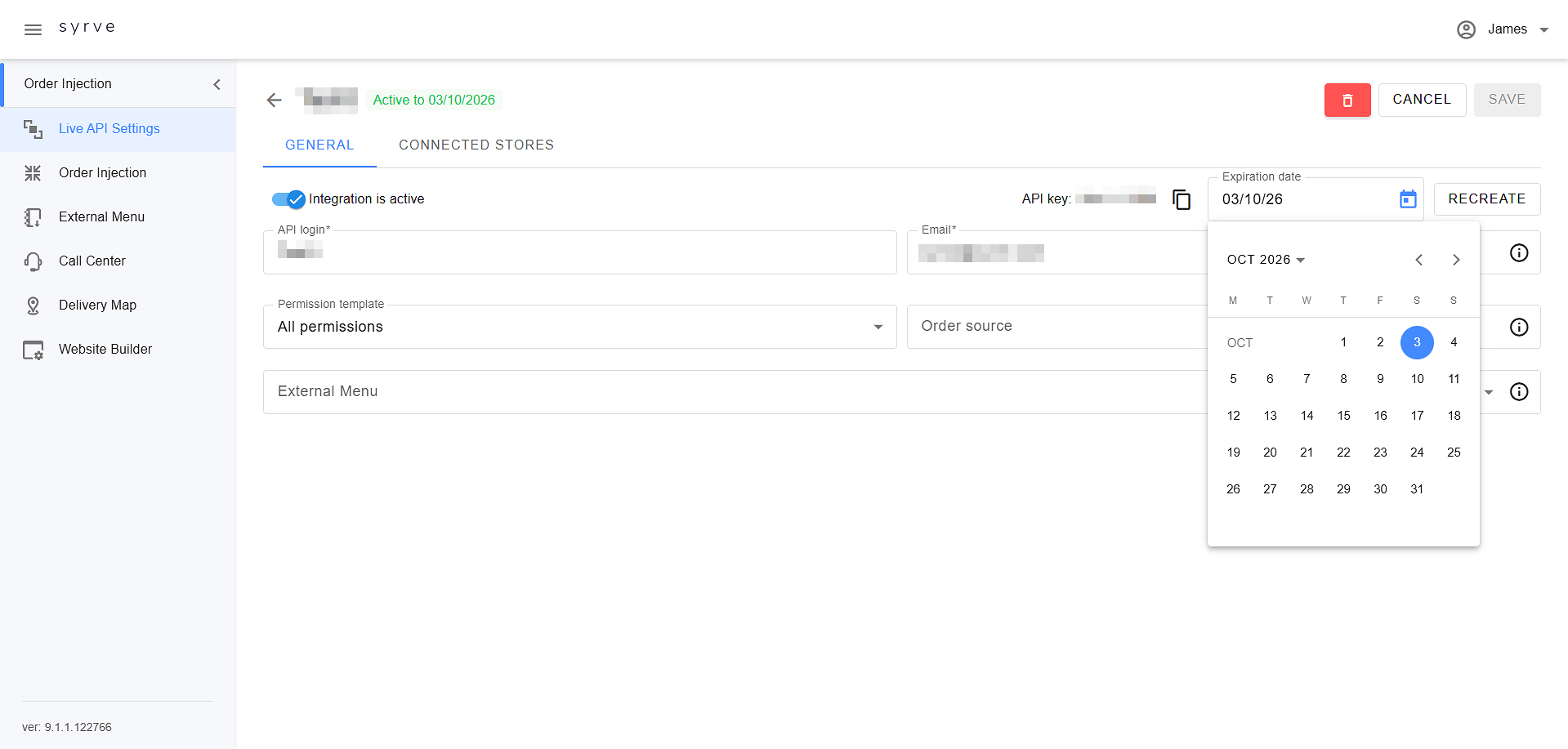W sekcji Ustawienia Live API w aplikacji Syrve możesz ustawić limit ważności klucza API. Maksymalny okres ważności to 2 lata. Po upływie określonego czasu klucz API zostanie dezaktywowany i nie będzie można korzystać z Live API za pomocą wygasłego klucza. Będzie trzeba go odnowić i określić nowy termin ważności.