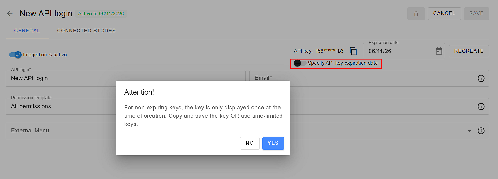 Możesz utworzyć klucz API bez daty wygaśnięcia, ale można go zobaczyć tylko w momencie generowania. Oznacza to, że musisz go skopiować i gdzieś zapisać do dalszego użytku, ponieważ po utworzeniu nie będzie można go ponownie wyświetlić. Takie klucze są przeznaczone dla wcześniej utworzonych integracji.