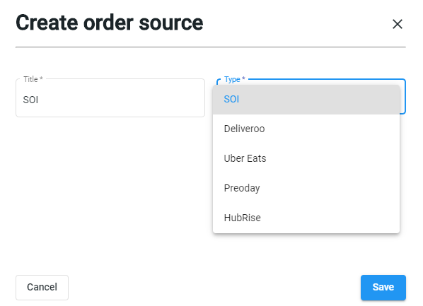 Na stronie konfiguracji źródła zamówień wpisz nazwę profilu integracji i wybierz jego typ. W wersji systemu 7.4 dostępne są następujące opcje do wyboru: SOI, Deliveroo, Uber Eats, Preoday. Aby skonfigurować integrację z systemem zewnętrznym, wybierz typ SOI (Simple Order Injection). Kliknij przycisk „Zapisz”, aby kontynuować konfigurację.