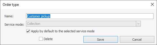 Typ zamówienia na odbiór | Typ zamówienia, który zostanie przypisany do zamówień, które gość odbierze osobiście w restauracji. Dla tego typu zamówienia Syrve musi utworzyć typ zamówienia z usługą Customer Pickup. ![]() |