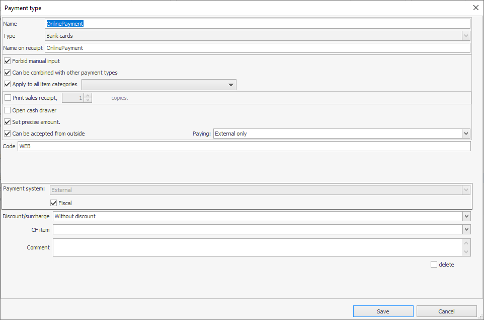 Metoda płatności | Typ płatności, którego Syrve będzie używać do opłacania zamówień opłaconych z góry na stronie internetowej (lub po stronie systemu zewnętrznego). Dla prawidłowego działania i poprawnego raportowania zaleca się następujące ustawienia: - Typ - Karty bankowe (wymagane); - Zabroń ręcznego wprowadzania - zaleca się wyłączyć używanie tego typu płatności na POS przy opłacaniu zamówień tworzonych w restauracji; - Może być akceptowana z zewnątrz (wymagane) - konieczne, aby wskazany typ płatności mógł być dodany do zamówienia utworzonego przez API; - Dokonywanie płatności - zaleca się wybrać opcję 'Tylko zewnętrzne'. Więcej informacji o ustawianiu typów płatności znajdziesz w rozdziale Karty bankowe w dokumentacji użytkownika. ![]() |