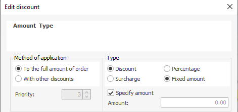 Typ rabatu | Niektóre systemy zewnętrzne używają własnego systemu rabatowego, który nie jest bezpośrednio powiązany z systemem rabatowym restauracji. W takim przypadku rabaty te muszą być uwzględnione przy przyjmowaniu zamówienia. W tym celu należy utworzyć specjalny rabat o dowolnej kwocie w Syrve. W tym celu wybierz opcję 'Przypisz kwotę w Syrve POS' w kreatorze tworzenia rabatu. ![]() Więcej informacji o konfiguracji rabatów znajdziesz w rozdziale Rabatów i dopłat w dokumentacji użytkownika. |