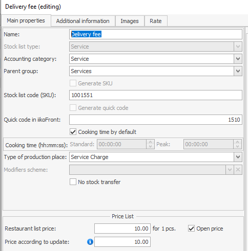Usługa dostawy | W niektórych przypadkach koszt dostawy nie jest wliczony w koszt zamówienia, lecz jest naliczany osobno. Dla prawidłowego rozliczenia tej kwoty należy utworzyć osobny produkt na liście magazynowej o typie 'Usługa' i cenie zerowej. Należy upewnić się, że ten produkt jest dostępny do sprzedaży (na przykład zdefiniowany jest dla niego typ miejsca przygotowania oraz ustawiona jest domyślna cena w karcie produktu lub w zamówieniu do zmiany menu). ![]() |