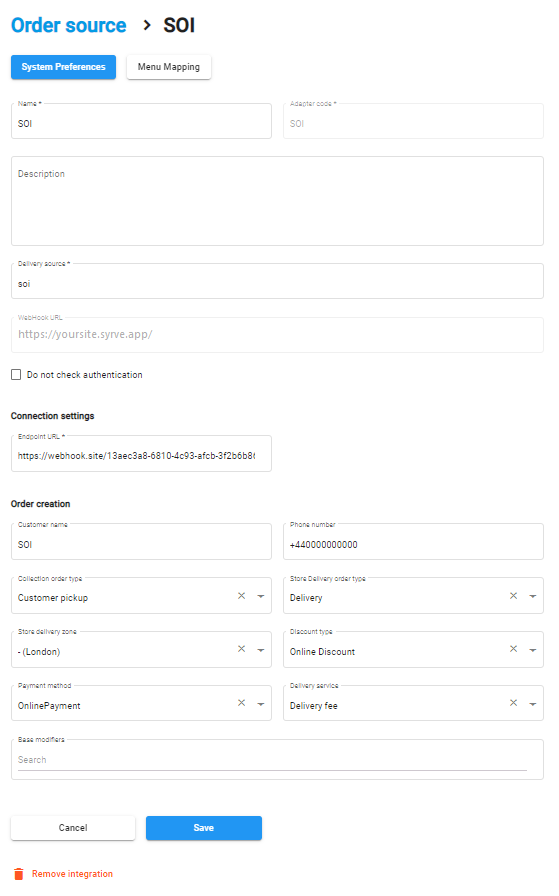 Nazwa klienta | Numer telefonu i nazwa gościa, dla którego zostanie utworzone zamówienie, jeśli system zewnętrzny nie dostarczy informacji o gościu w zamówieniu. - fikcyjny numer telefonu spełniający wymagania formatu międzynarodowego, na przykład +70000000000 lub +441111111111); - przykładowa nazwa gościa, na przykład SOI; Zaleca się wcześniejsze utworzenie gościa dostawy z tymi parametrami w Syrve. |