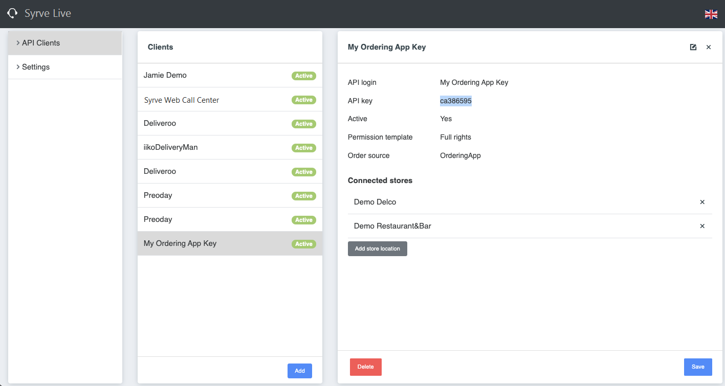 Klucz API zapewnia dostęp do wybranych sklepów i części danych (np. zamówienia na dowóz/na wynos, rezerwacje stolików itp.).