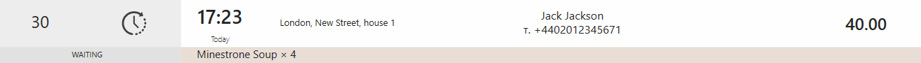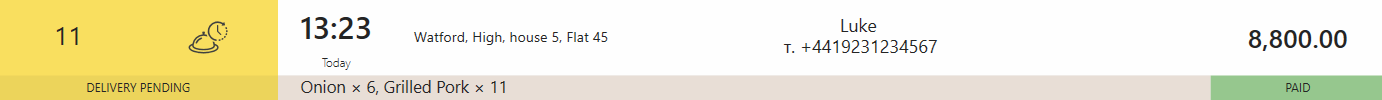 | Oczekuje na dostawę | ![]() | Zamówienie zostało ugotowane, ale kierowca nie został jeszcze przydzielony. Jeśli płatność zostanie zarejestrowana w momencie wysyłki, zamówienie jest uznawane za opłacone, a paragon fiskalny zostanie wydrukowany. Zobacz Czas płatności zamówienia. |