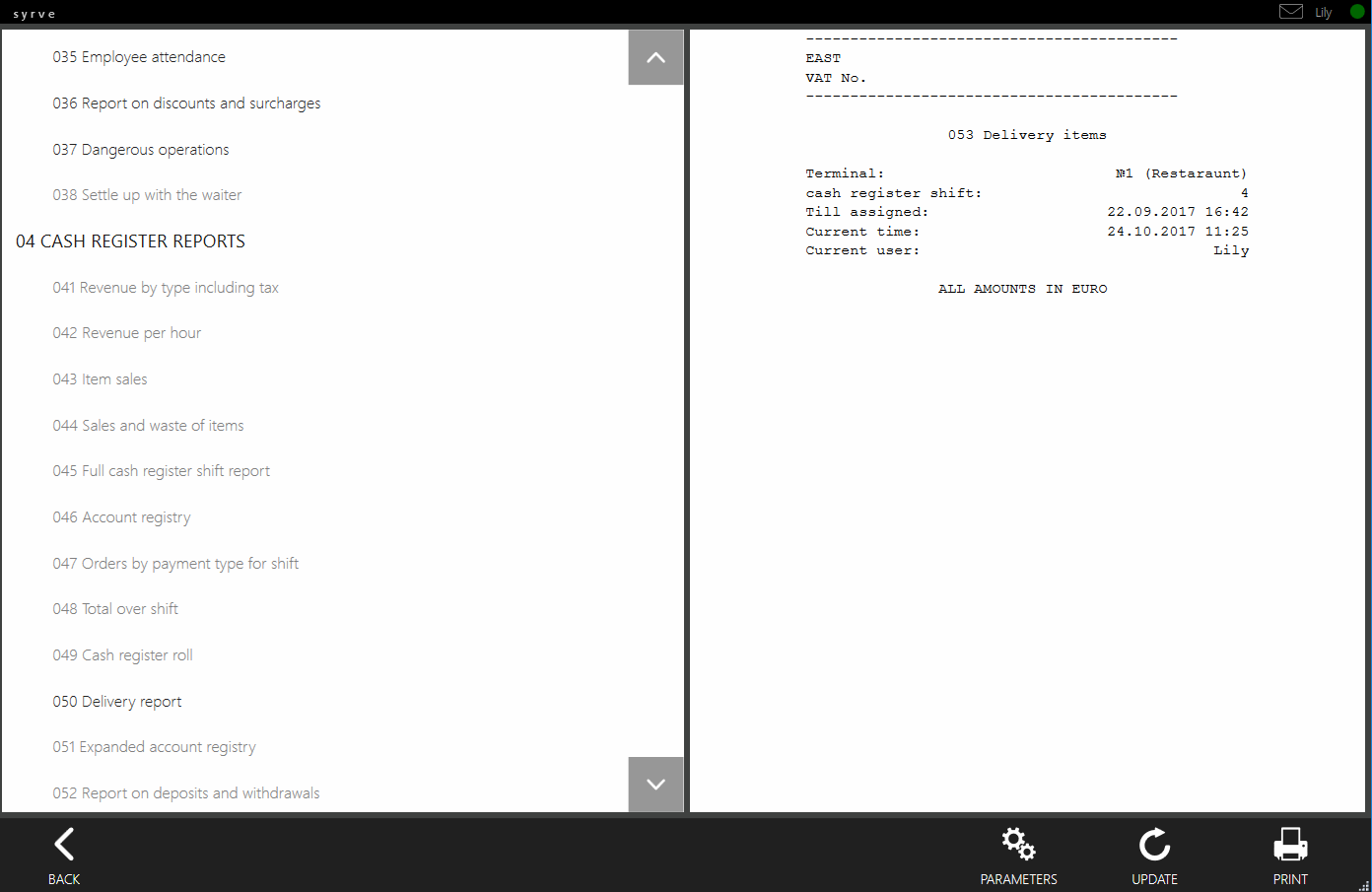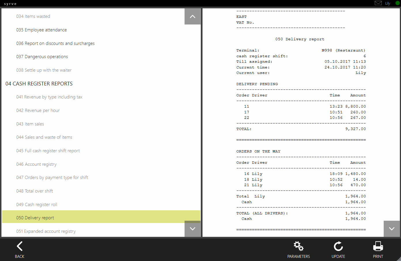 Jeśli masz odpowiednie uprawnienia, możesz wygenerować i wydrukować „050 Raport dostawy” oraz „053 Dania”, aby przygotować raport dostaw dla bieżącej zmiany kasjera.