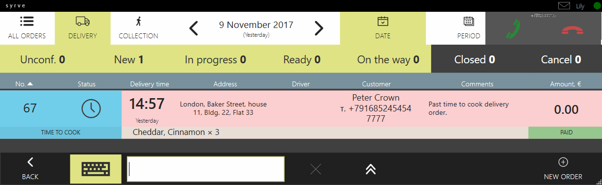 - Załóżmy, że klient nie zostanie znaleziony. W takim przypadku tworzona jest nowa dostawa, a numer wpisywany jest w pole telefonu.