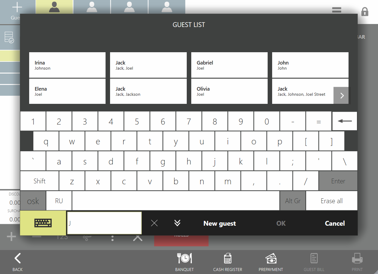 Po kliknięciu Nowa dostawa na liście dostaw przejdziesz do ekranu wyboru klienta. Tutaj możesz zobaczyć listę klientów, którzy mają historię zamówień. Aby szybko wyszukać klienta, kliknij pole znajdujące się na dole ekranu (po prawej stronie przycisku klawiatury ekranowej) i wprowadź informacje o kliencie.