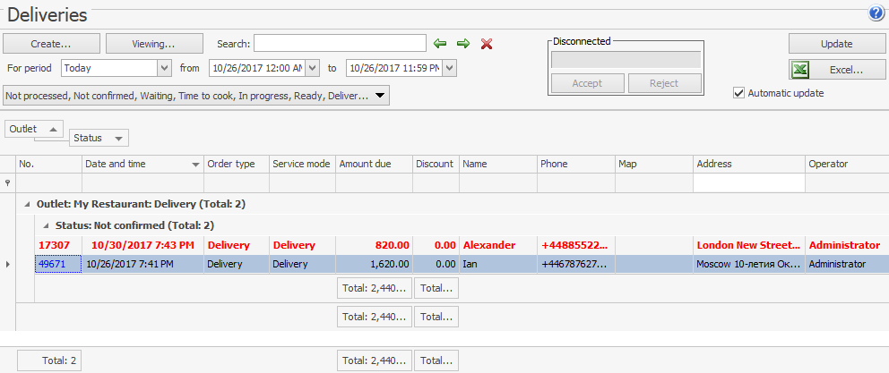 Jeśli opcja Automatyczna aktualizacja jest włączona, informacje o dostawach będą odświeżane automatycznie w odstępach jednominutowych. Okres aktualizacji danych można określić w pliku konfiguracyjnym Syrve Office. Aktualne informacje o dostawach można uzyskać w dowolnym momencie, klikając Aktualizuj.