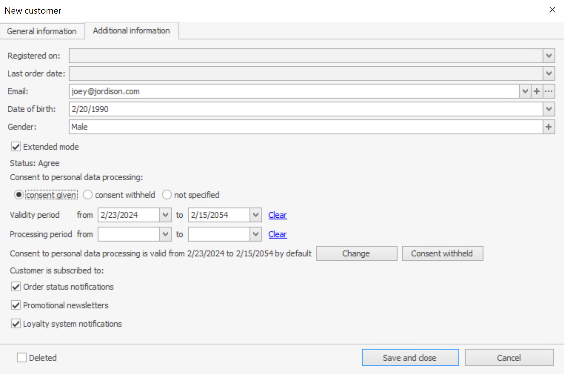 Możesz dodać nowego klienta do listy klientów dostaw oraz ostatecznie do listy gości bankietów i rezerwacji, a także do bazy lojalnościowej, w sekcji Klienci dostaw. Po wejściu w tę sekcję kliknij Dodaj... i podaj dane klienta na karcie Informacje ogólne, a następnie określ zgodę klienta na przetwarzanie danych osobowych na karcie Dodatkowe informacje.