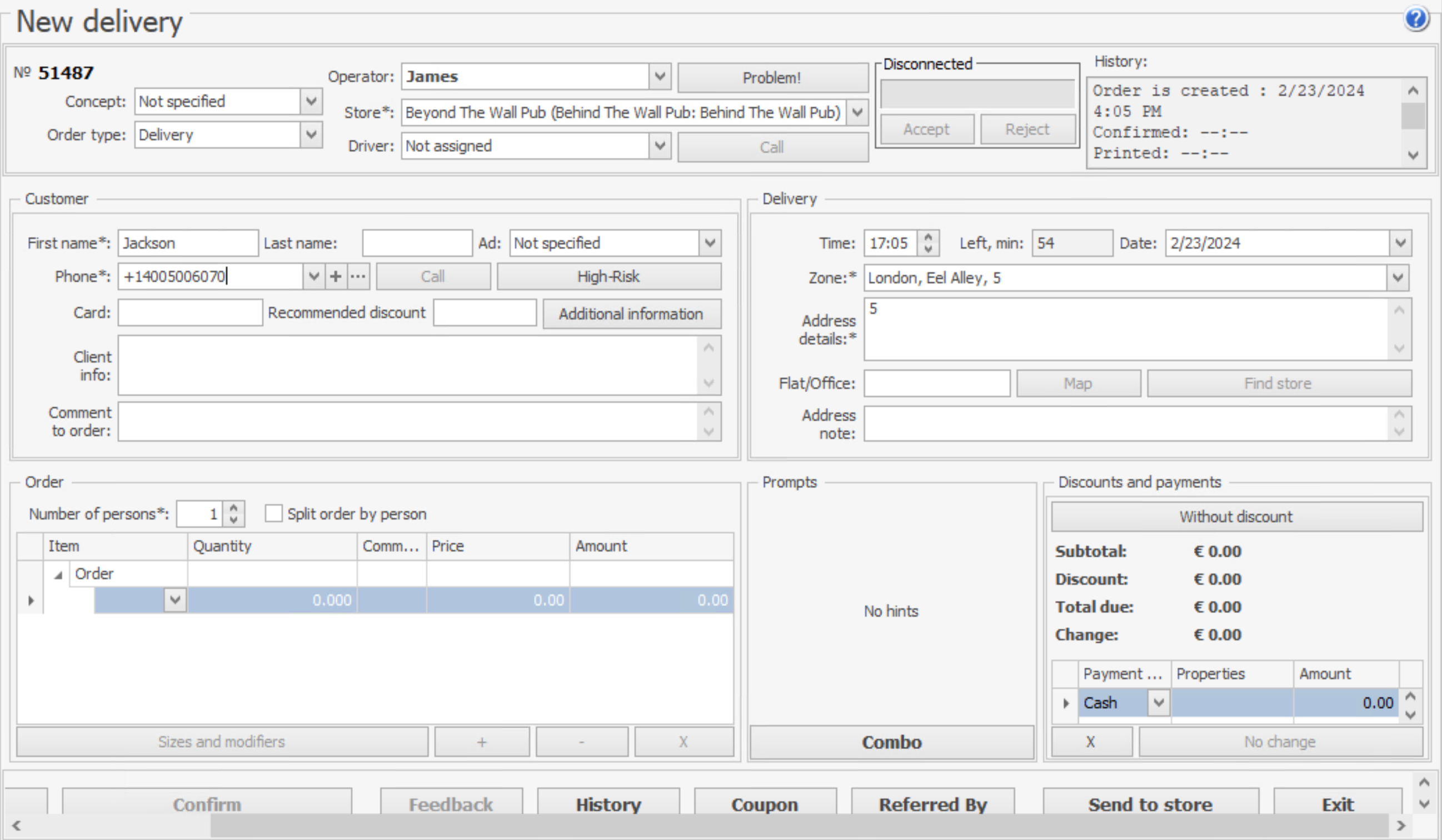 Jeśli terminal jest podłączony do centrali telefonicznej, system znajdzie klienta po numerze telefonu i utworzy dla niego nową dostawę. Pole telefonu zostanie wypełnione numerem, który może różnić się od ostatniego używanego do kontaktu z klientem (zobacz Połączenia telefoniczne w call center).