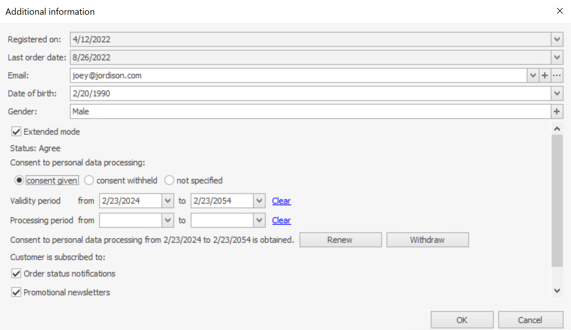 Wypełnij kartę dostawy. Jeśli klient został wybrany z listy, oznacza to, że karta dostawy jest już wstępnie wypełniona jego danymi. W przeciwnym razie należy wypełnić odpowiednie pola nazwiskiem osoby kontaktowej, numerem telefonu oraz adresem, pod który ma zostać dostarczona przesyłka (grupa parametrów Klient i Dostawa). Aby określić dodatkowe informacje o kliencie oraz jego zgodę na przetwarzanie danych osobowych, kliknij Dodatkowe informacje znajdujące się w bloku Klient w rekordzie dostawy.