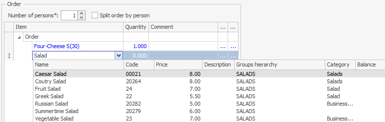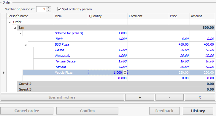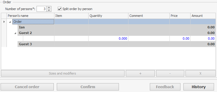 Na życzenie klienta zamówienie może być podzielone między kilka osób. Można określić imię każdej osoby. Podczas zapisywania zamówienia do sklepu, pozycje mogą być do niego dodawane zgodnie z tym podziałem. Podział według osób jest pokazany na fakturze. Zawiera sumę częściową dla każdej osoby oraz kwotę całkowitą. Imiona gości w zamówieniu są drukowane na naklejkach do pozycji menu.