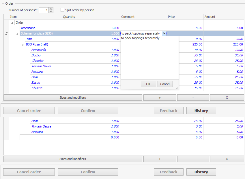 Na przykład klient może zamówić pizzę przygotowaną według standardowego przepisu lub skomponować ją z proponowanych składników. Klient może zrezygnować z niektórych głównych składników zawartych w standardowym przepisie. Cena pizzy nie ulegnie zmianie. Dodatkowe dodatki można zamówić za dodatkową opłatą. Kucharz wie z biletu kuchennego, których składników użyć do przygotowania pizzy, a których nie używać. Po sprzedaniu dania odpisywane są tylko składniki zawarte w zamówieniu. Składniki, z których klient zrezygnował, nie są odpisywane.