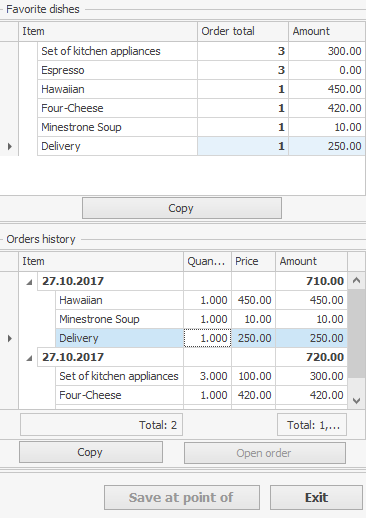 - Aby powtórzyć jedno z poprzednich zamówień klienta, wybierz wiersz z datą zamówienia i kliknij Kopiuj. Wszystkie dania zostaną przeniesione z tego zamówienia do nowego. Możesz skopiować kilka zamówień, wybierając wiersze z odpowiednimi datami za pomocą Ctrl lub Shift.