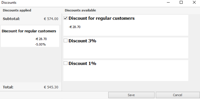 - Zaznacz wymagane rabaty. Dodane rabaty pojawią się po lewej stronie okna. Całkowita kwota zostanie przeliczona z uwzględnieniem wybranych rabatów.