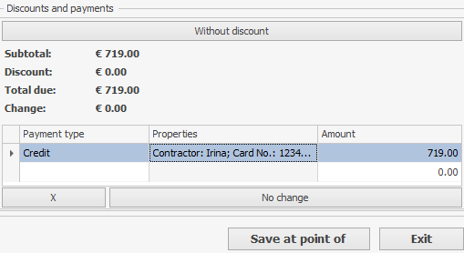 Płatność bezgotówkowa jest dostępna jako kredyt dla kontrahenta. Załóżmy, że klient płaci za zamówienie środkami z jego konta w punkcie sprzedaży. Saldo kontrahentów można sprawdzić w menu Kontrahenci lub Raporty.