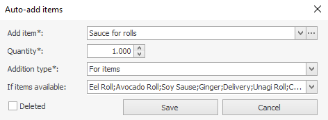 Na przykład, jeśli klient zamówił tylko pizzę, nie potrzebuje zestawu pałeczek. W tym celu w polu Jeśli dostępne pozycje określ tylko pozycje kuchni japońskiej. Jeśli pozostawisz to pole puste, pozycja zostanie dodana do każdego zamówienia niezależnie od jego zawartości.