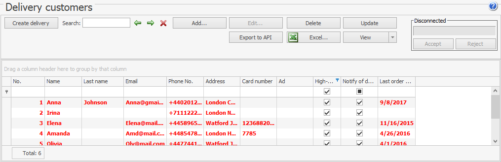 Tacy klienci są wyświetlani na liście klientów dostawy czerwonym fontem. Aby zobaczyć tylko niewiarygodnych klientów, zaznacz kolumnę Wysokie Ryzyko.