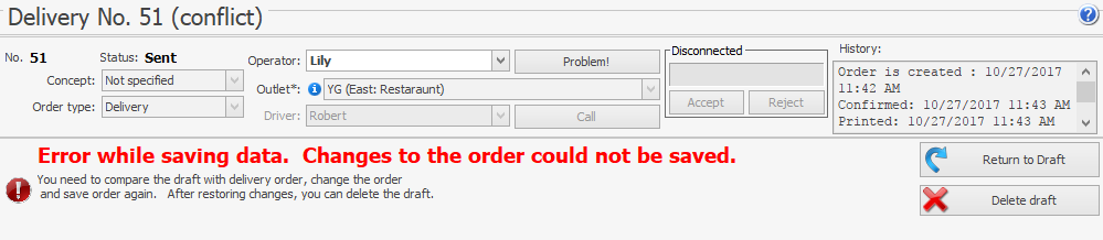 Jeśli menedżer w punkcie sprzedaży nie zwróci uwagi na powiadomienie i zmieni dostawę lub jej status, zmiany dokonane przez call center nie zostaną uwzględnione w dostawie i będzie konieczne ich ponowne wprowadzenie. Karta dostawy w call center wyświetli komunikat o błędzie zapisu danych. Operator będzie musiał przywrócić zmiany, korzystając z zapisanego „szkicu”.