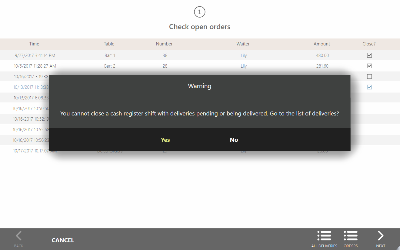 Podczas zamykania zmiany kasy system sprawdza niezamknięte zamówienia. Zmiana zawierająca zamówienia na dostawę o statusie „Oczekuje na dostawę” lub „W drodze” nie może zostać zamknięta, ponieważ w takim przypadku weryfikacja kasy ujawni rozbieżność między środkami w raporcie kasy a szufladą kasową. Najpierw musisz zwrócić paragon fiskalny za te zamówienia, a następnie postępować zgodnie z procedurą zamykania zmiany. W tym celu przejdź do listy dostaw, klikając Tak.