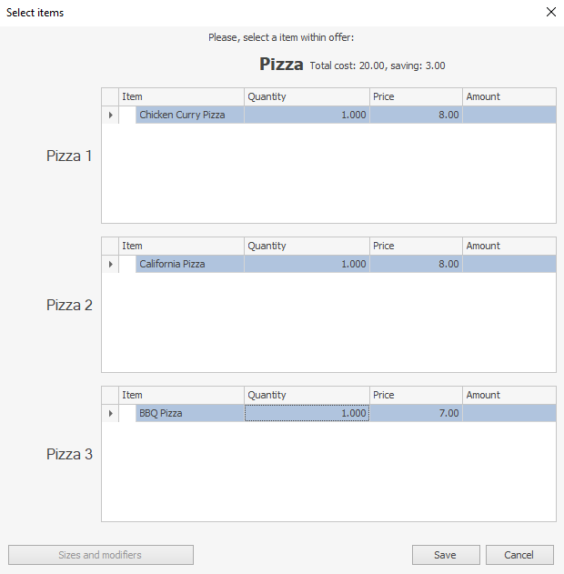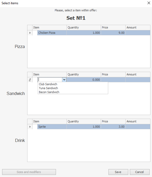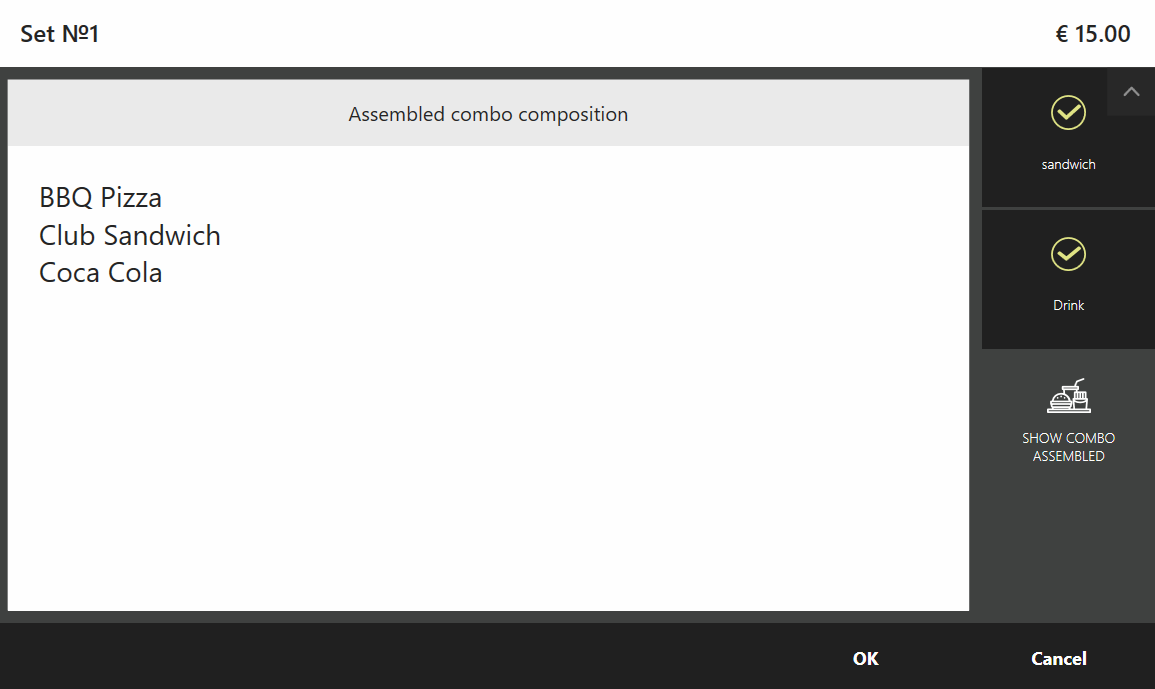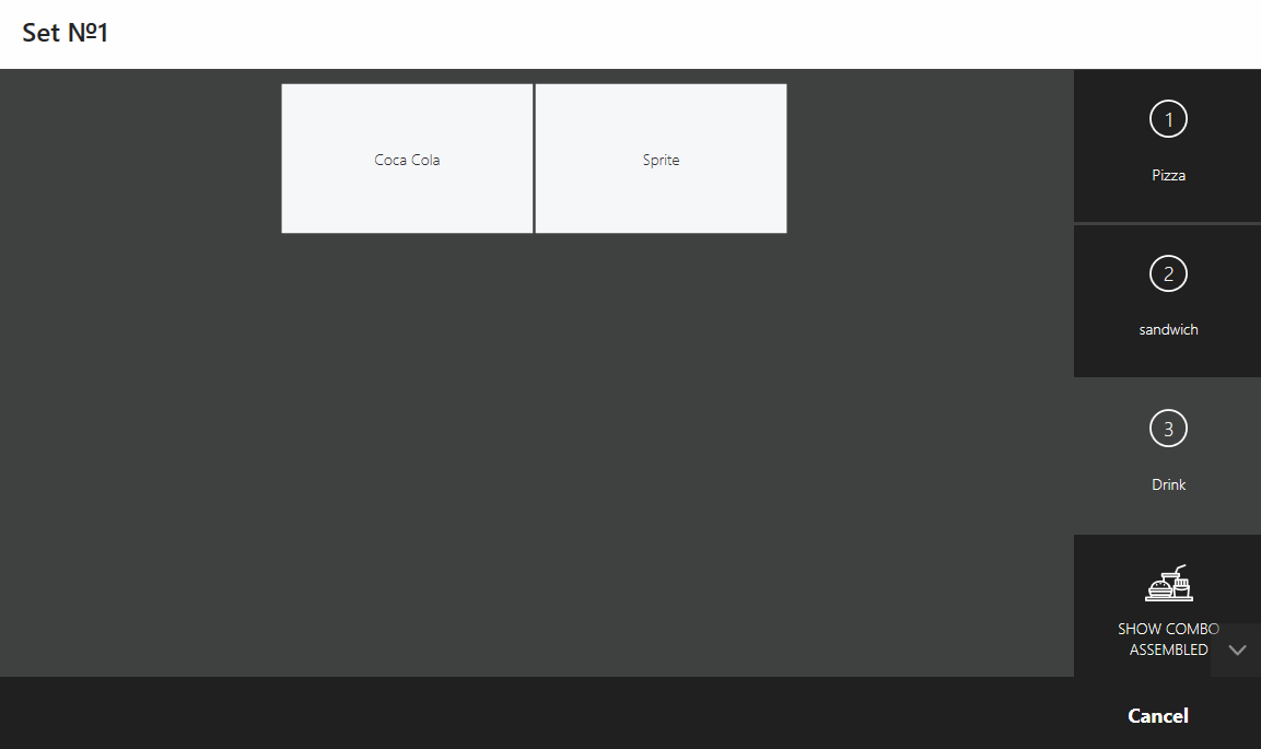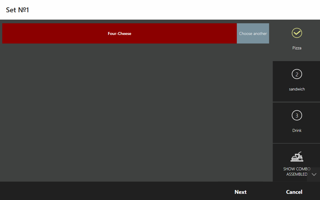 Dodaj pozycje do zamówienia, np. pizzę lub kanapkę. Pozycje te mogą być częścią combo w menu. W związku z tym, zgodnie ze specjalnymi ustawieniami, zobaczysz podpowiedź, jakie combo można skompletować.