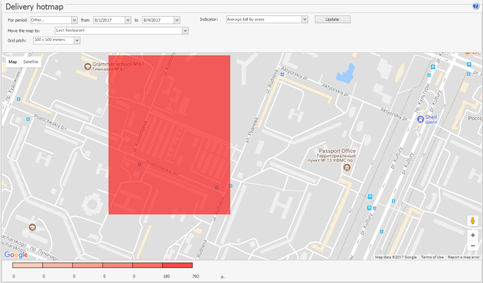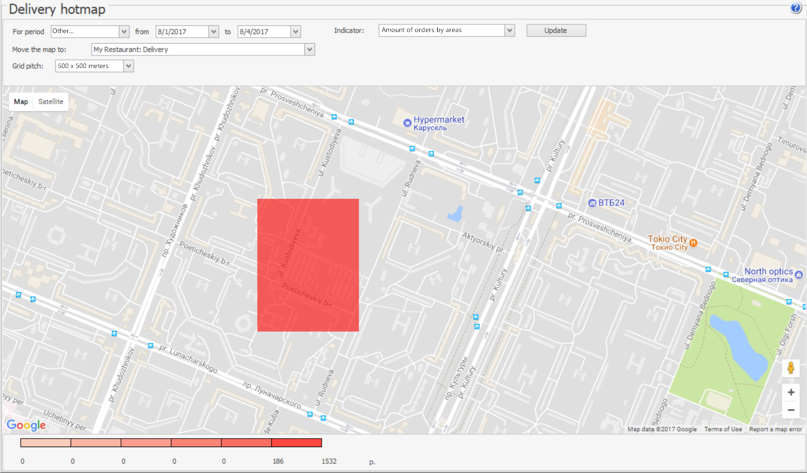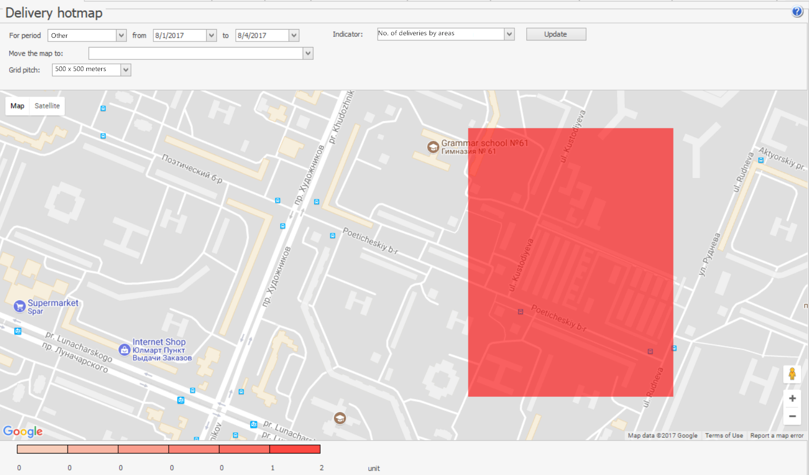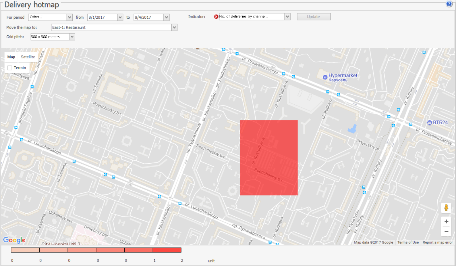 - Domyślnie mapa jest powiększona na obszarze, gdzie zarejestrowano najwyższą wartość wybranego wskaźnika w określonym okresie. Jeśli jest więcej niż jeden punkt dostawy, wybierz wymagany terminal z pola Przesuń mapę do, aby móc szybko poruszać się po mapie. Mapa skupi się na adresie terminala podanym w karcie. Jeśli adres nie jest podany, nie można poruszać się po mapie, a system wyświetli ostrzeżenie o tym.