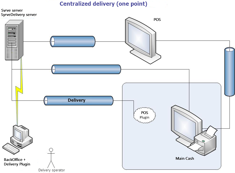 W przeciwieństwie do dostawy terminalowej, zamówienia na dostawę zarządzane centralnie w ramach jednej restauracji są początkowo wprowadzane w Syrve Office. W przypadku małej sieci restauracji działającej w ramach jednej restauracji (Syrve), podczas gdy inne lokale reprezentują grupy tej restauracji, call center może być zintegrowane z tym serwerem.