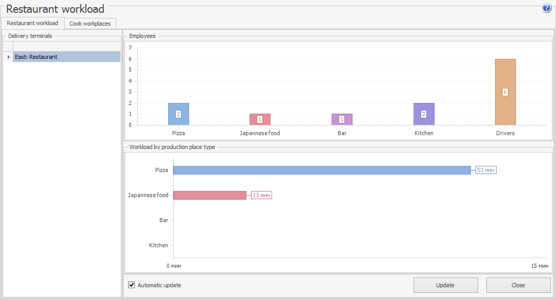 - Pracownicy Wykresy dostarczają informacji o wydajności każdego punktu przygotowania i kierowców. Odpowiada to liczbie zalogowanych pracowników przypisanych do określonego typu miejsca przygotowania. Aby wykresy wyświetlały się poprawnie, należy skonfigurować stanowiska kucharzy (patrz Stanowiska kucharzy).