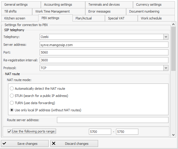 Terminale powinny być podłączone do PBX, aby obsługiwać połączenia w Syrve POS. Połączenie terminala można skonfigurować w ustawieniach sprzętu. Parametry do podłączenia terminala do PBX możesz uzyskać od swojego dostawcy. Każdy terminal musi mieć skonfigurowane swoje konto PBX.