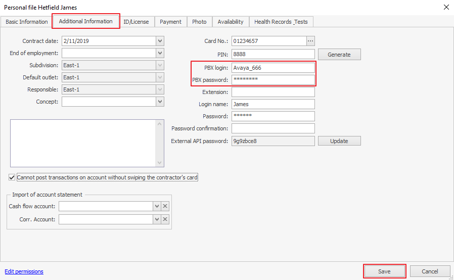 Teraz udziel dostępu pracownikowi, który będzie korzystał z połączeń SIP. Przejdź do głównego menu Pracownicy i wybierz katalog Pracownicy. Otwórz kartotekę pracownika i na zakładce Informacje dodatkowe podaj login PBX oraz hasło PBX. Zapisz zmiany.