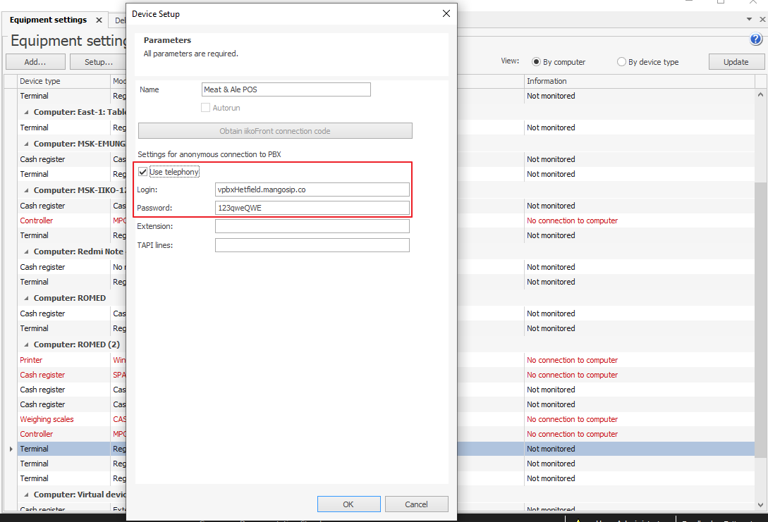 w Syrve Office przejdź do Ustawienia sklepu. Kliknij dwukrotnie terminal, aby otworzyć okno Konfiguracja urządzenia. Zaznacz opcję Użyj telefonii, podaj swój Login i Hasło, a następnie kliknij OK. Jak skonfigurować połączenia telefoniczne w POS, znajdziesz w artykule Połączenia telefoniczne w Syrve POS.
