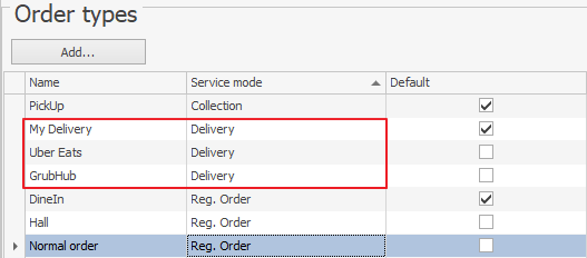 Dodaj usługę dostawy jedzenia oraz własną dostawę do bazy Typów zamówień. Wszystkie typy zamówień powinny mieć ten sam tryb usługi — Dostawa.