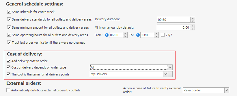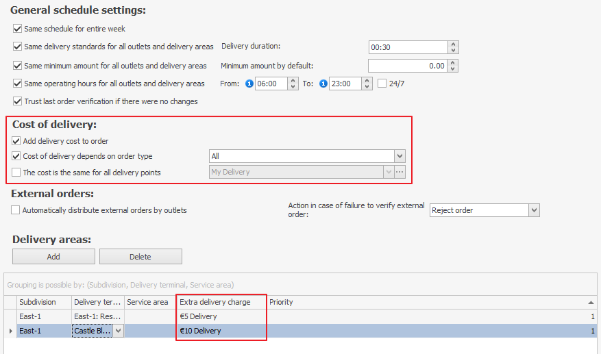 Możesz tak skonfigurować system, aby opłata za dostawę była doliczana w momencie wysłania zamówienia do punktu. Opłaty za dostawę mogą się różnić w zależności od strefy dostawy, pory dnia i rodzaju zamówienia, a także mogą być takie same dla wszystkich punktów.