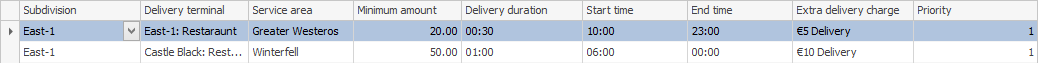 W nocy niektóre punkty sprzedaży mogą być zamknięte, a ich zamówienia są obsługiwane przez punkt dyżurny. Możesz przypisać kilka stref dostawy do takiego punktu. W ciągu dnia punkt ten obsługuje tylko jedną strefę, natomiast w nocy obejmuje wszystkie obszary. Szczegóły znajdziesz w Przykładzie 4. Obsługa nocna.