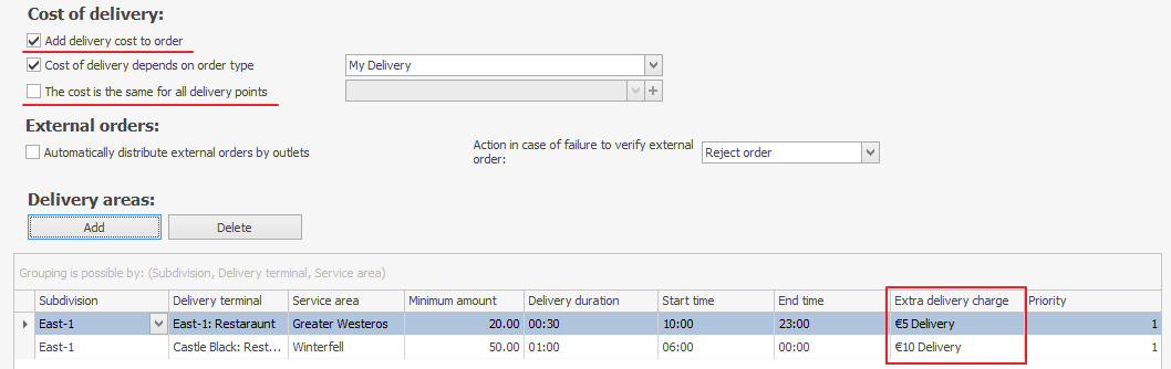W naszym przypadku przebieg jest następujący: klient składa zamówienie za pośrednictwem usługi dostawy jedzenia, zamówienie przyjmuje typ odpowiadający nazwie usługi, dostawa jest bezpłatna. Jeśli zamówienie ma być dostarczone przez własną usługę dostawy, zamówienie przyjmuje typ Dostawa własna i ma przypisaną cenę. Jeśli opłata za dostawę powinna być różna na różnych terminalach lub zależeć od strefy dostawy, nie zaznaczaj opcji Taki sam koszt dla wszystkich punktów dostawy. Użyj tabeli Obszary dostawy, aby wybrać cenę dla każdego terminala indywidualnie.