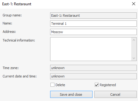 Aby otworzyć kartę terminala, kliknij go dwukrotnie lub wybierz z listy i kliknij Edytuj. W karcie możesz ustawić nazwę terminala, jego adres oraz określić informacje techniczne, które mogą być przekazane do API. Ponadto w karcie możesz zarejestrować, anulować rejestrację oraz usunąć terminal.