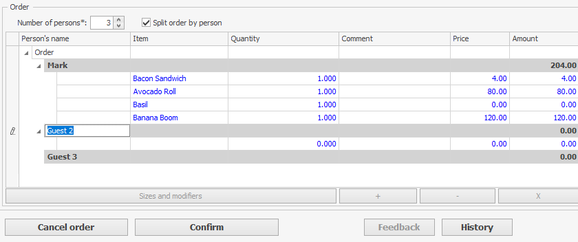 - Dodaj pozycje pierwszej osoby do zamówienia jak zwykle (zobacz Pozycje zamówienia). Suma, € w wierszu z imieniem osoby pokazuje sumę częściową dla tej osoby.