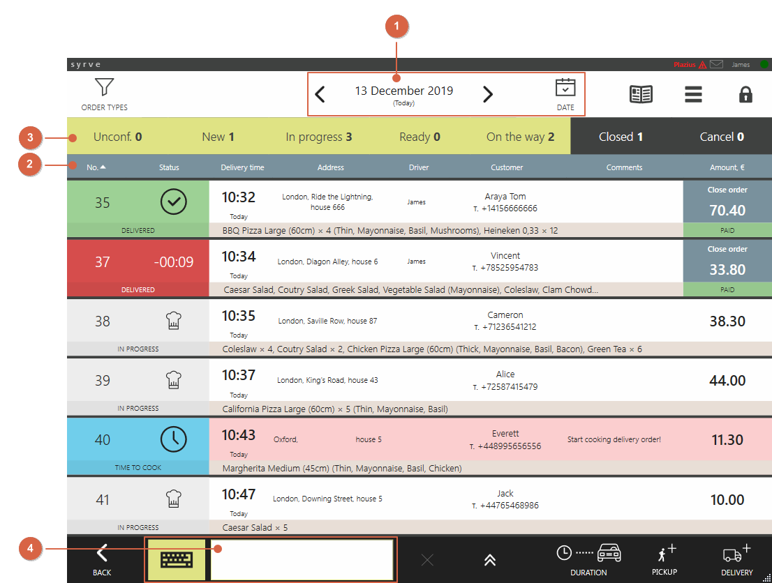 - Status zamówienia – aktualny stan zamówienia. Szczegóły znajdziesz w artykule Statusy zamówień w Syrve Delivery.