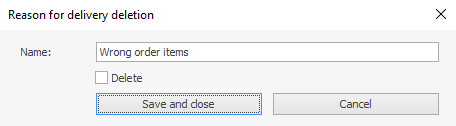 - Kliknij Dodaj. Pojawi się okno Powód usunięcia dostawy.