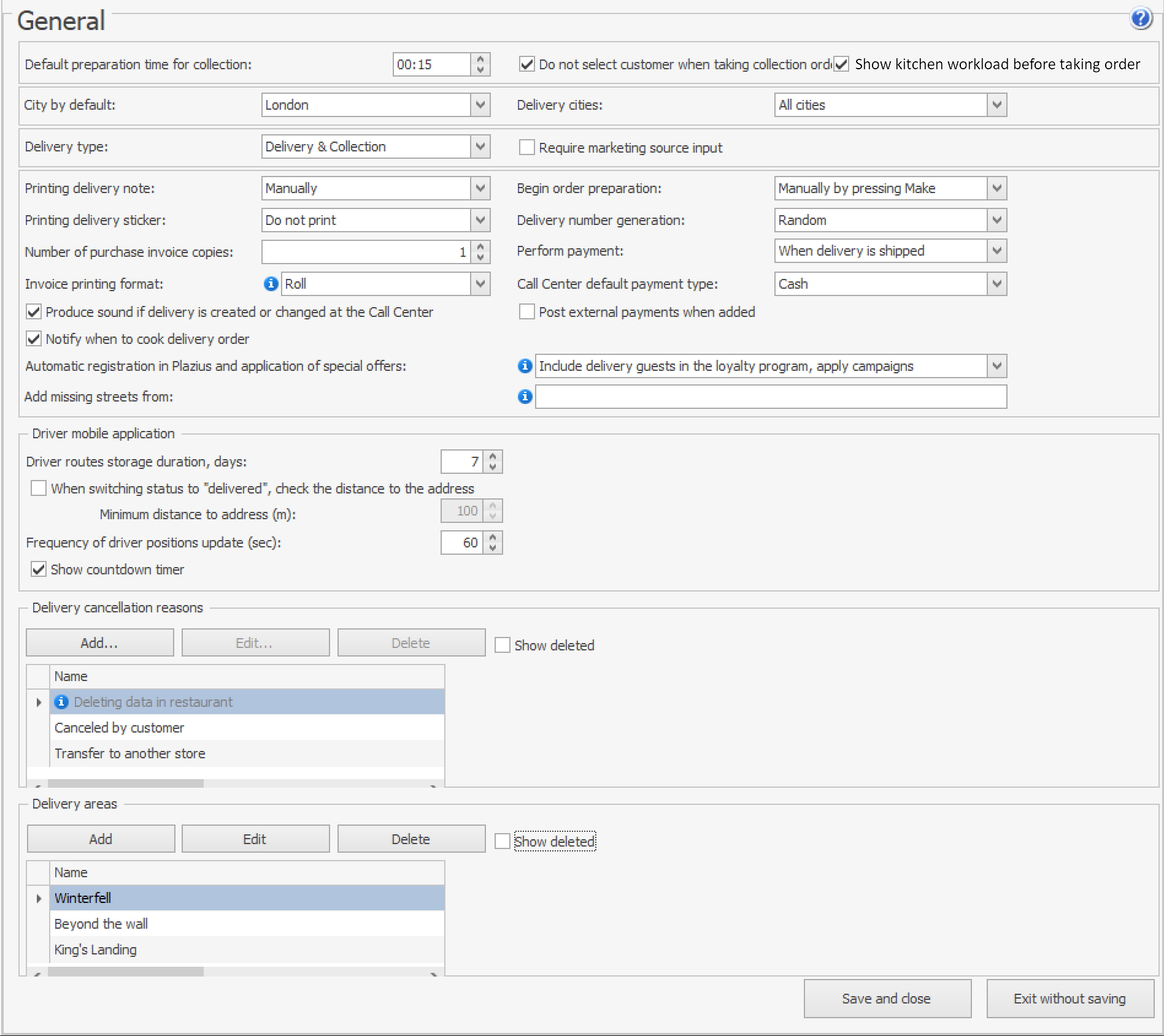 Pole Miasta dostawy jest używane w sieciach restauracji. W ustawieniach każdego punktu dostawy określ miasto, do którego dostarcza. Tylko to miasto będzie dostępne w Syrve POS. Więcej informacji o ustawieniach dostawy w sieciach restauracji znajdziesz w artykule Centralizacja dostawy.