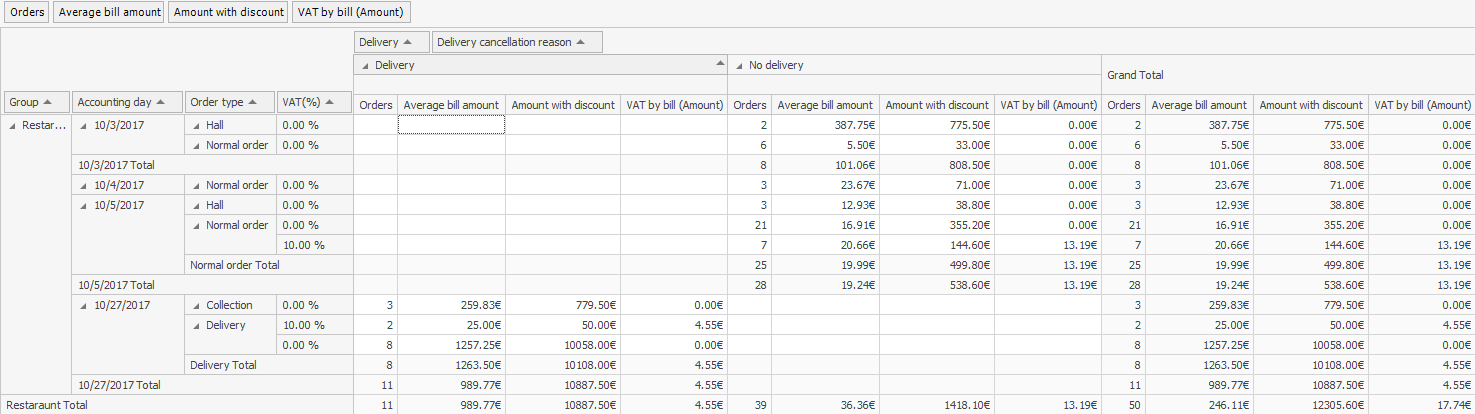 Szczegółowe informacje o zamówieniach według typów usług można uzyskać z raportów za pomocą analitycznego atrybutu „typ zamówienia”. Możesz również użyć tego parametru do ustawienia różnych stawek podatkowych dla różnych typów usług. Przykład ustawień ulg podatkowych dla produktów na wynos znajduje się w Podręczniku użytkownika Syrve POS.