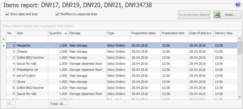Korzystając z raportu Wykreślenie Towarów, możesz uzyskać listę towarów (składników), które są potrzebne do przygotowania zamówionych dań. Gdy wybierzesz kilka zamówień, składniki dań zostaną zsumowane. Możesz otrzymać raport wykreślenia dla dostaw o dowolnym statusie. Na przykład możesz wybrać nowe zamówienia, które mają być dostarczone mniej więcej w tym samym czasie, i upewnić się, że wszystkie produkty potrzebne do ich przygotowania są dostępne w magazynie. Możesz także uzyskać listę produktów, które muszą zostać zakupione. Aby to zrobić, możesz użyć Listy produktów w menu skrótów.