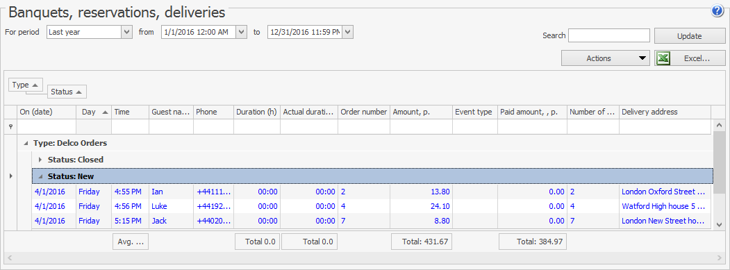Raport 'Bankiety, Rezerwacje i Dostawy' dostarcza informacji o zamówieniach na bankiety i rezerwacje oraz zamówieniach na dostawy. Raport ten jest dostępny w Raporty (Sprzedaż) lub Sprzedaż detaliczna.