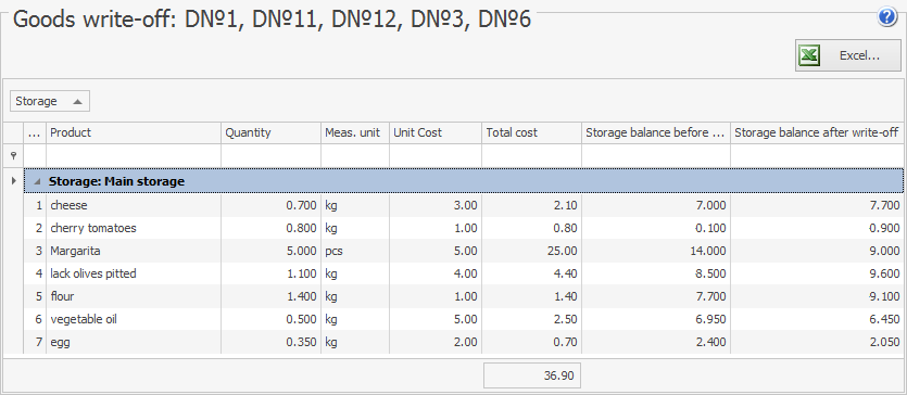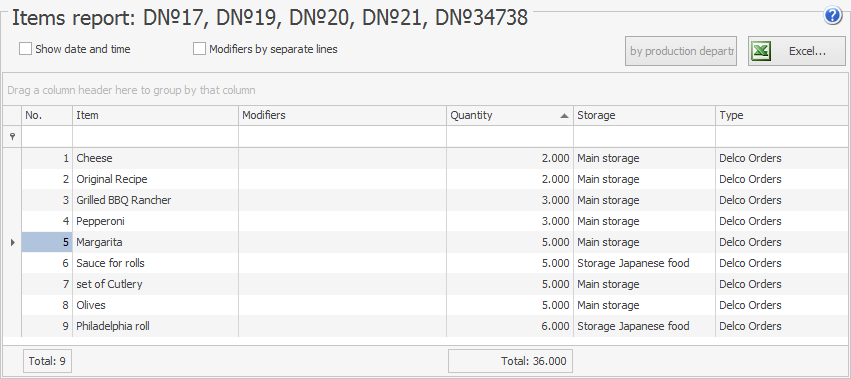 Korzystając z raportu Wykreślenie Towarów, możesz uzyskać listę towarów (składników), które są potrzebne do przygotowania zamówionych dań. Gdy wybierzesz kilka zamówień, składniki dań zostaną zsumowane. Możesz otrzymać raport wykreślenia dla dostaw o dowolnym statusie. Na przykład możesz wybrać nowe zamówienia, które mają być dostarczone mniej więcej w tym samym czasie, i upewnić się, że wszystkie produkty potrzebne do ich przygotowania są dostępne w magazynie. Możesz także uzyskać listę produktów, które muszą zostać zakupione. Aby to zrobić, możesz użyć Listy produktów w menu skrótów.