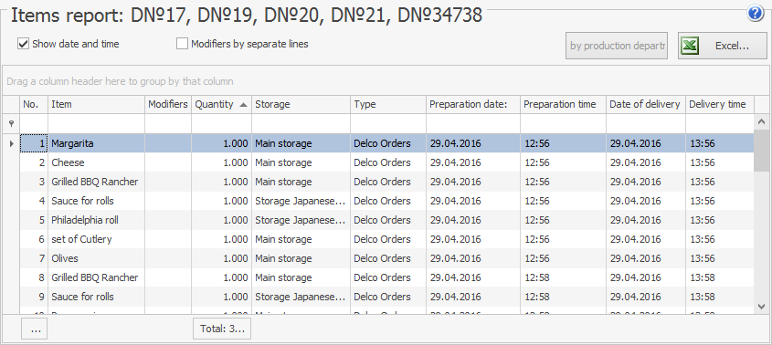 Za pomocą raportu Pozycji w menu skrótów możesz uzyskać listę dań w zamówieniu. Gdy wybierzesz kilka zamówień, podobne dania zostaną zsumowane.