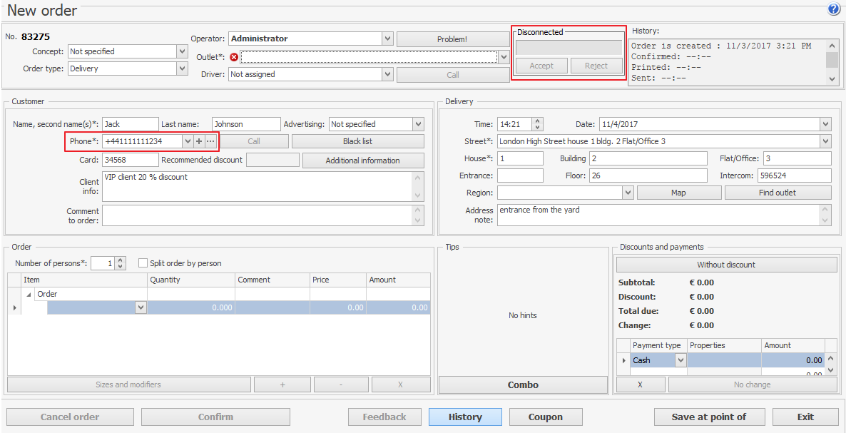 - Załóżmy, że klient ma już zamówienie. System odnajduje je po numerze telefonu i otwiera. Jeśli zostanie znalezionych kilka takich zamówień, otwiera się pierwsze według czasu dostawy.