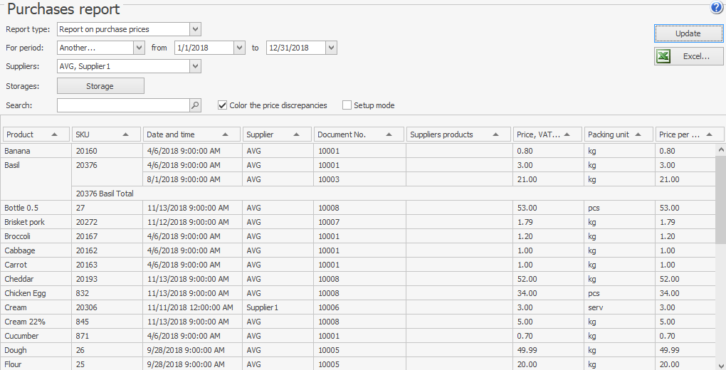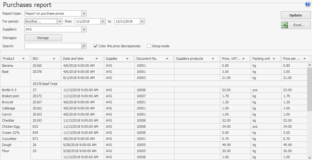 - Raport zakupów. Użyj go, aby porównać ceny określone na fakturze zakupu i cenniku dostawcy. W tym celu musisz skonfigurować cenniki dostawców w Syrve.