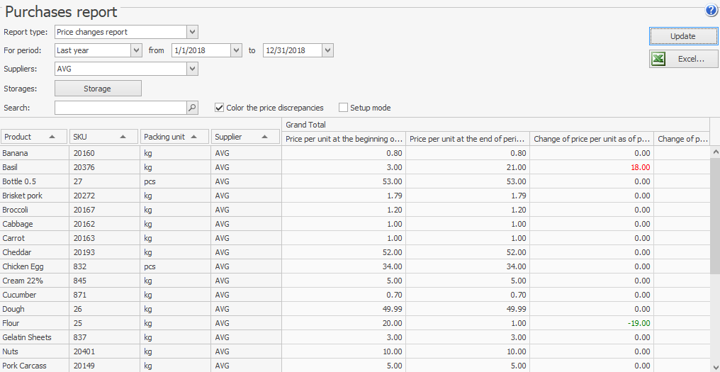 Raport Zmiany cen pokazuje ceny w dokumentach dostawy dla każdego dostawcy na początku i na końcu okresu. Umożliwia to analizę zachowania cen w wybranym okresie.